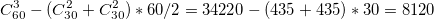 Ну по логике: C^3_32 -(C^2_16 + C^2_15)*32/2 = 4960 - (120+105)*32/2 = 1360