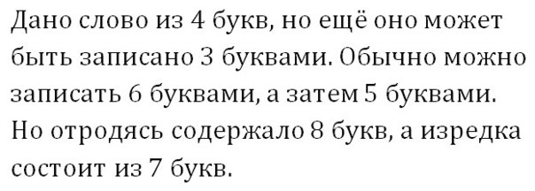 Дано - 4 букв, еще - 3 букв, обычно - 6 букв, затем - 5 букв, отродясь - 8 букв, изредка - 7букв!!!!!