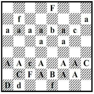 На диаграмме изображена позиция, которая могла бы произойти в шахматной партии. Одинаковыми буквами обозначены одинаковые фигуры, разными - разные. Белые фигуры обозначены заглавными буквами, а черные - строчными. Всего на доске 14 белых и 14 черных фигур. Расшифруйте позицию.